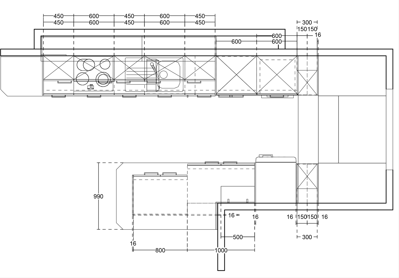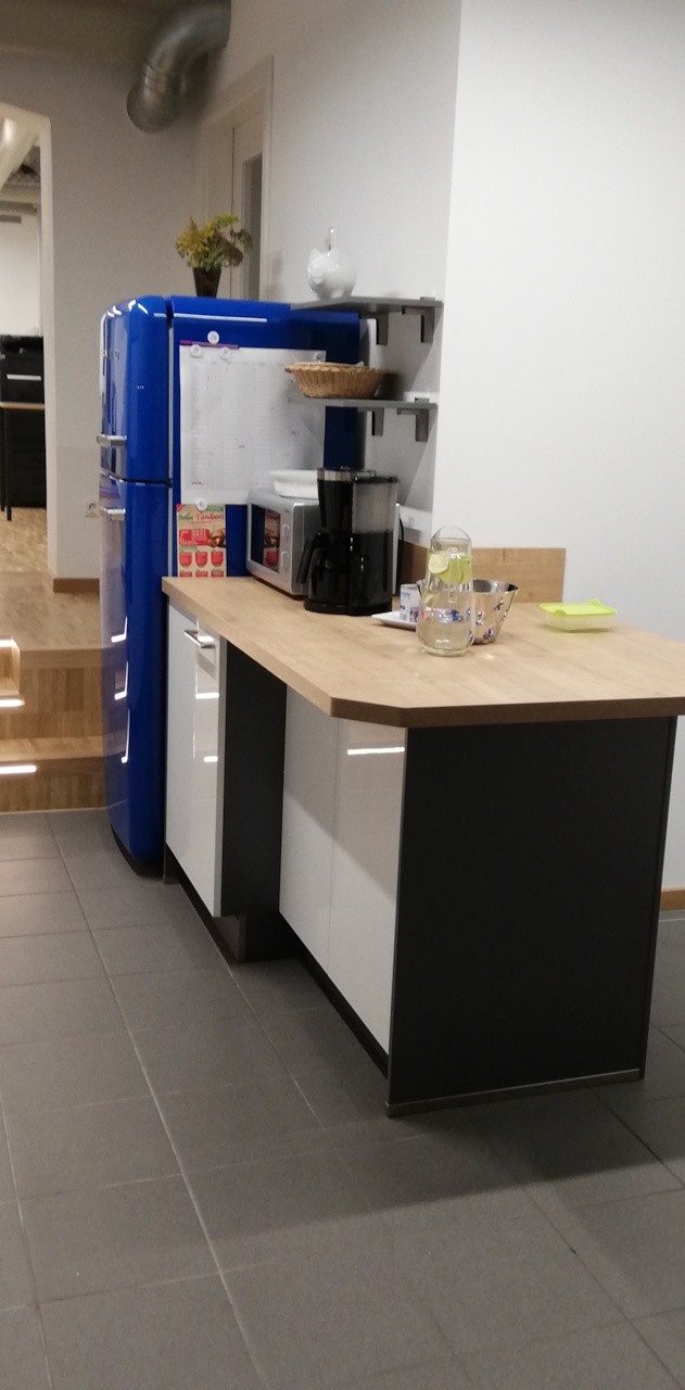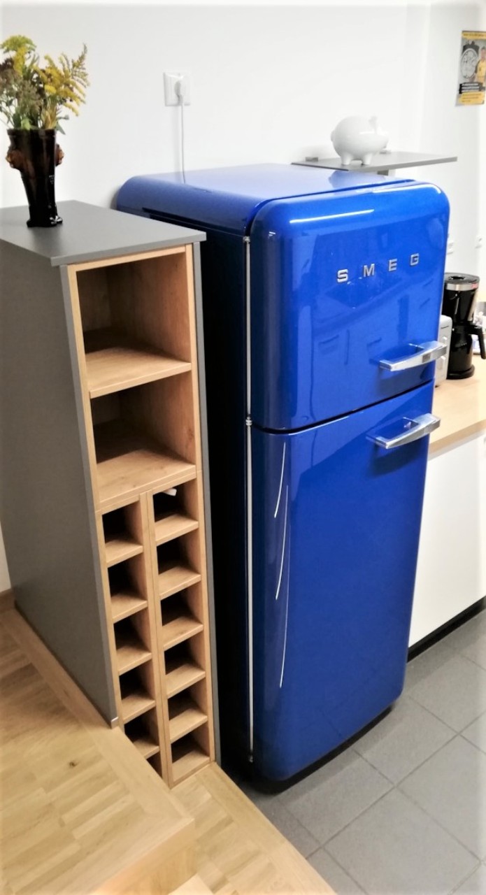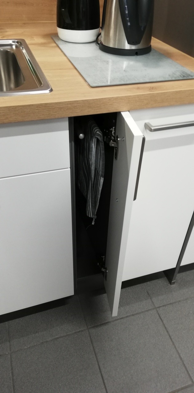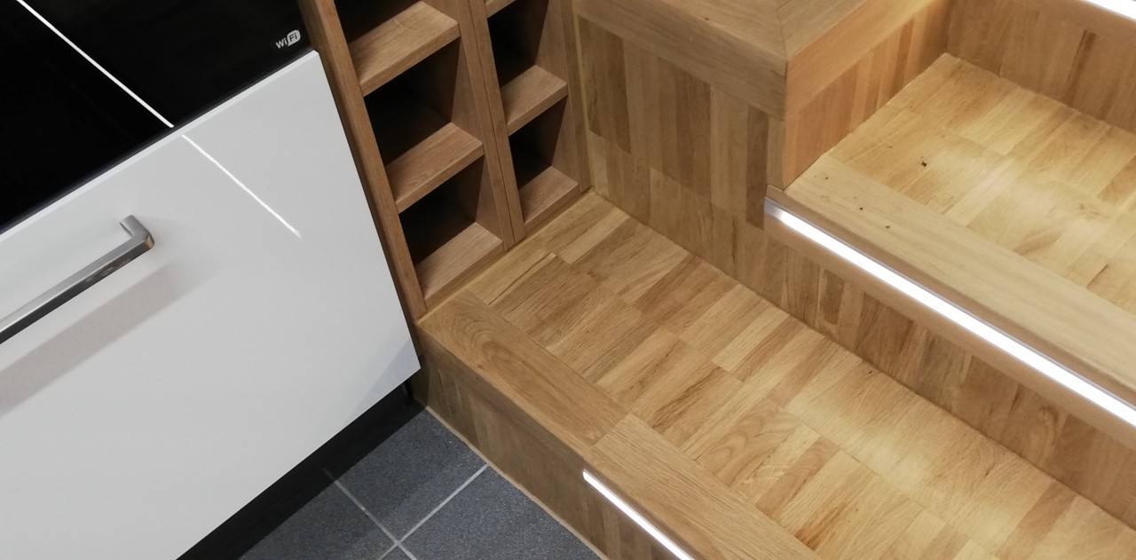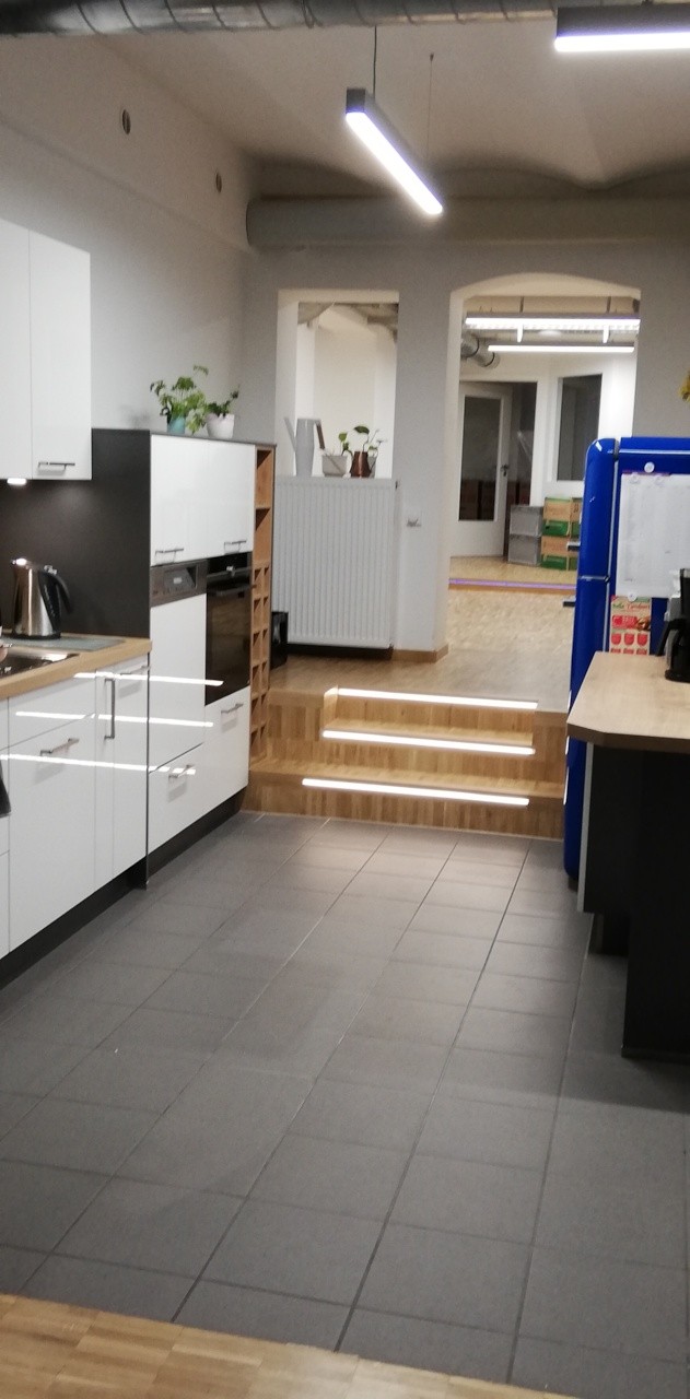 Besonderheit ist hier die Anpassung der Regale an die Treppenstufen und viel Stauraum unter der Inselplatte. Die Oberschränke sind an der Trockenwand vorgebaut worden, sodass eine Nische für eine 90 cm tiefe Arbeitsplatte entstanden ist. Die teilgewerbliche Spülmaschine mit 14 Minuten Schnellprogramm ermöglicht ein zeitnahes Reinigen und ist auch für die Mitarbeiter eine Arbeitserleichterung.