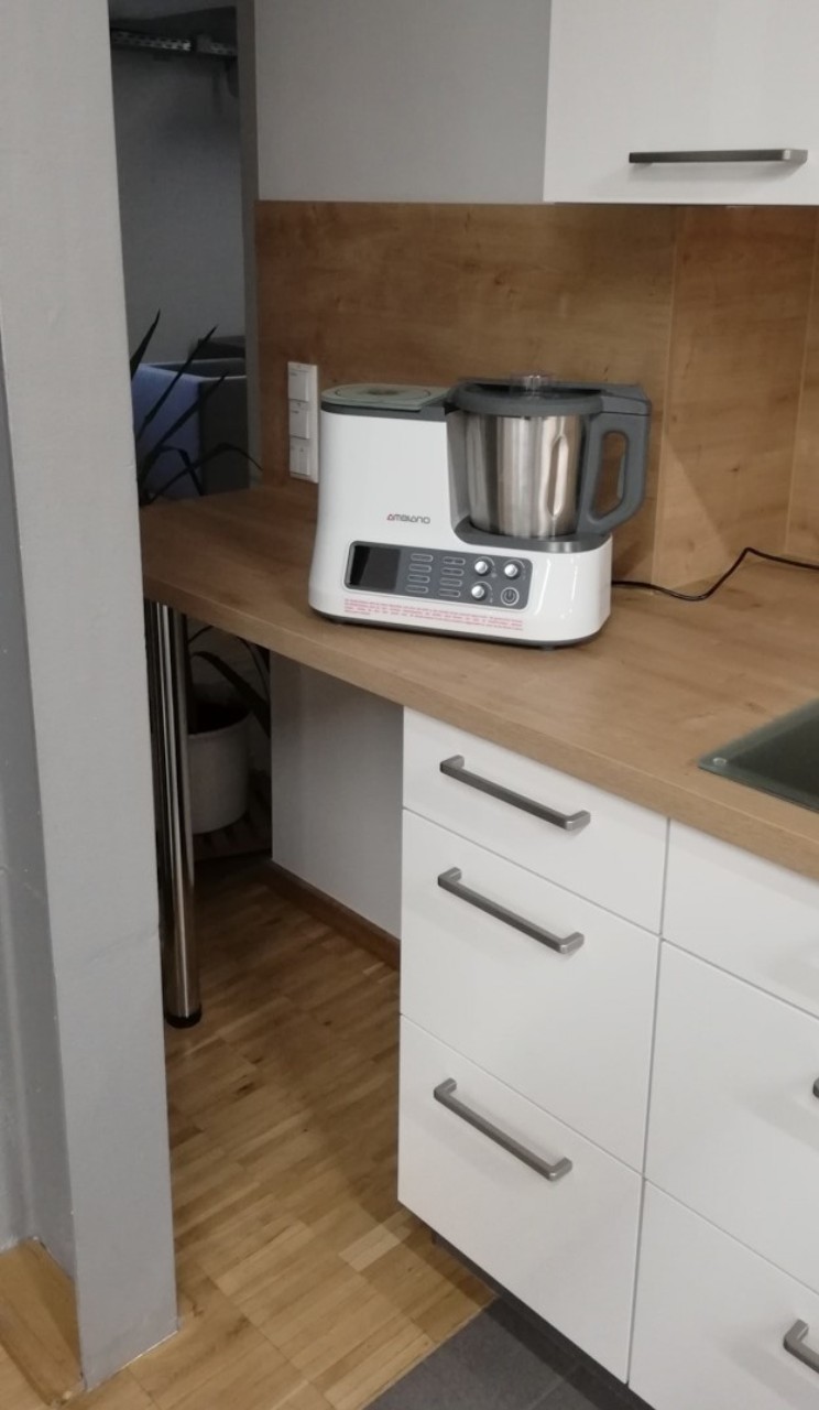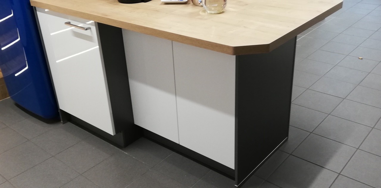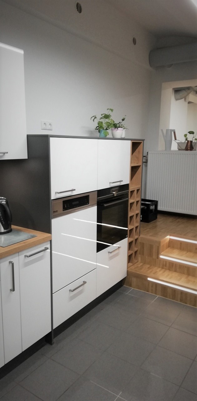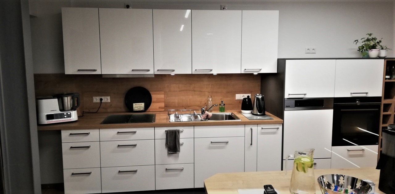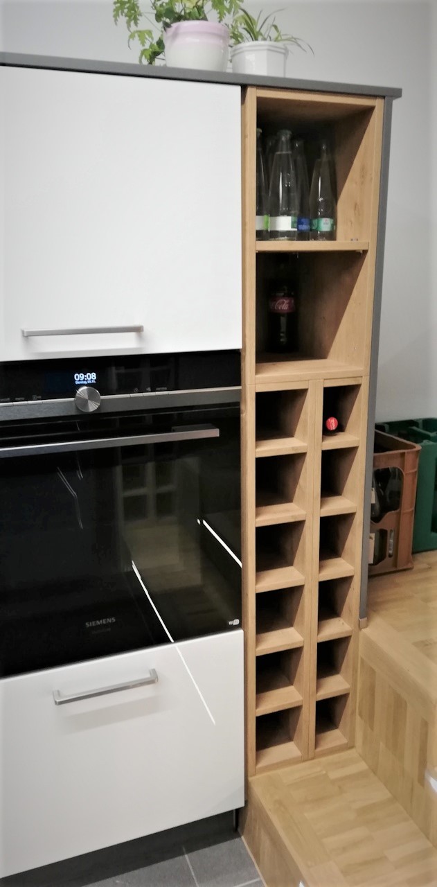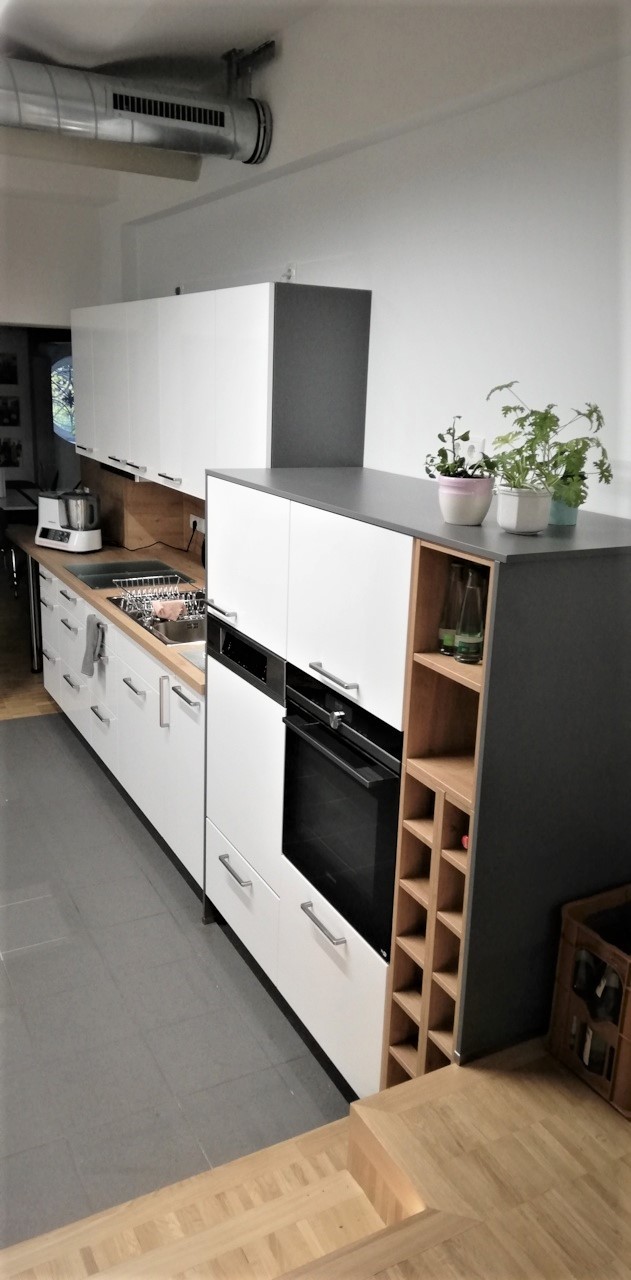 Die Fronten sind in Lacklaminat weiß Hochglanz, der Korpus in quarzgrau, Arbeitsplatte und Nischenverkleidung in Chalet-Eiche gehalten.