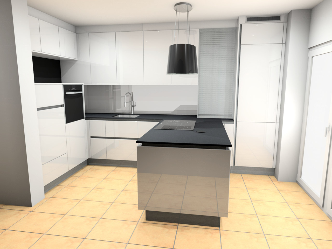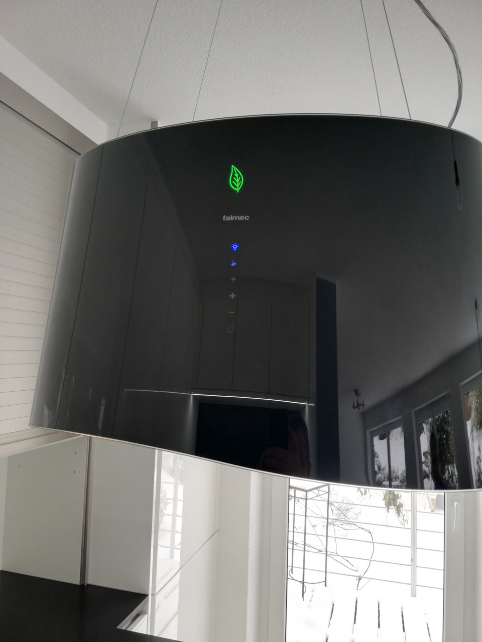 Ein besonderer Blickfang bietet hier das flächenbündig eingebaute Kochfeld und der Inseldunstabzug mit Ionisationssystem zur Luftreinigung über einen regenerierbaren Zeolith-Filter, der sich mit gleichem Lackglanz und chickem Look an das Küchendesign anpasst.