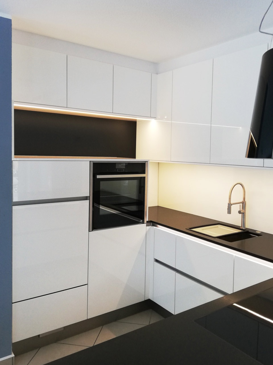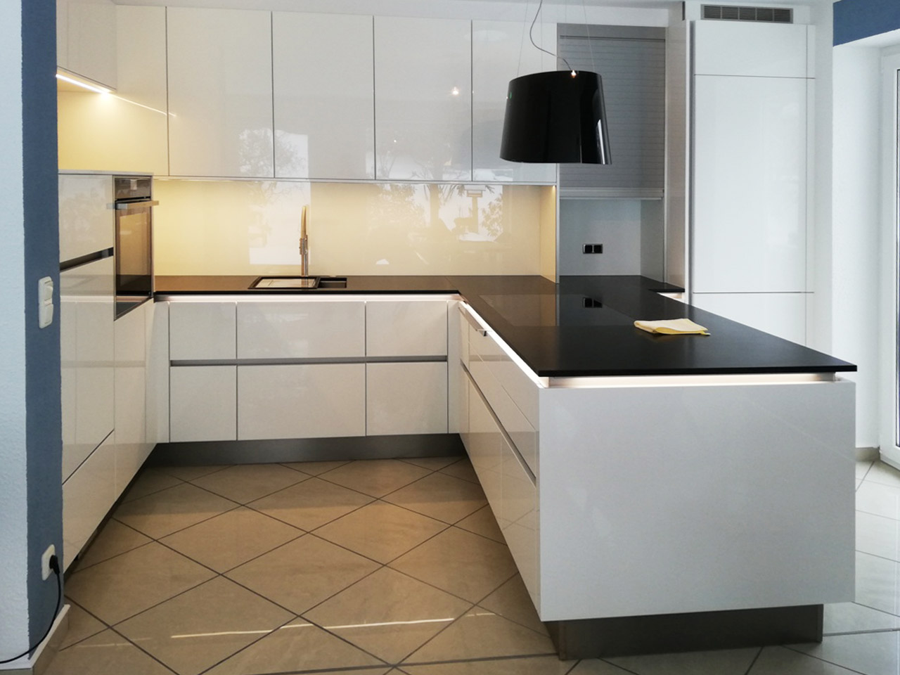 Der Glanz dieser Küche, die in Coburg realisiert wurde, bezieht sich nicht nur auf die hochglänzende Echtlack-Front mit mehrschichtigem Lackaufbau, sondern auch auf all ihre Eigenschaften.