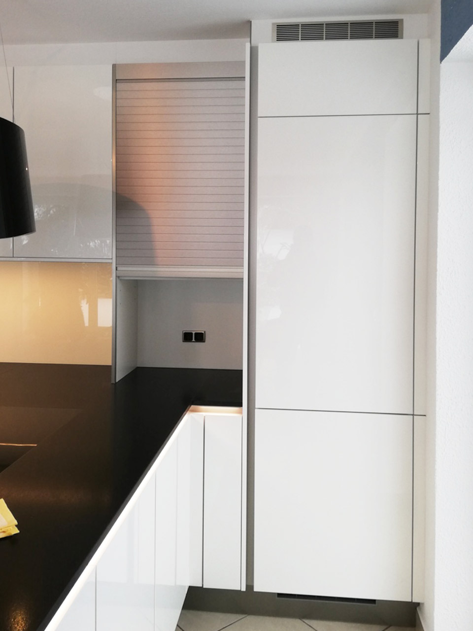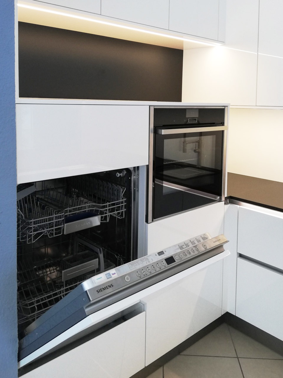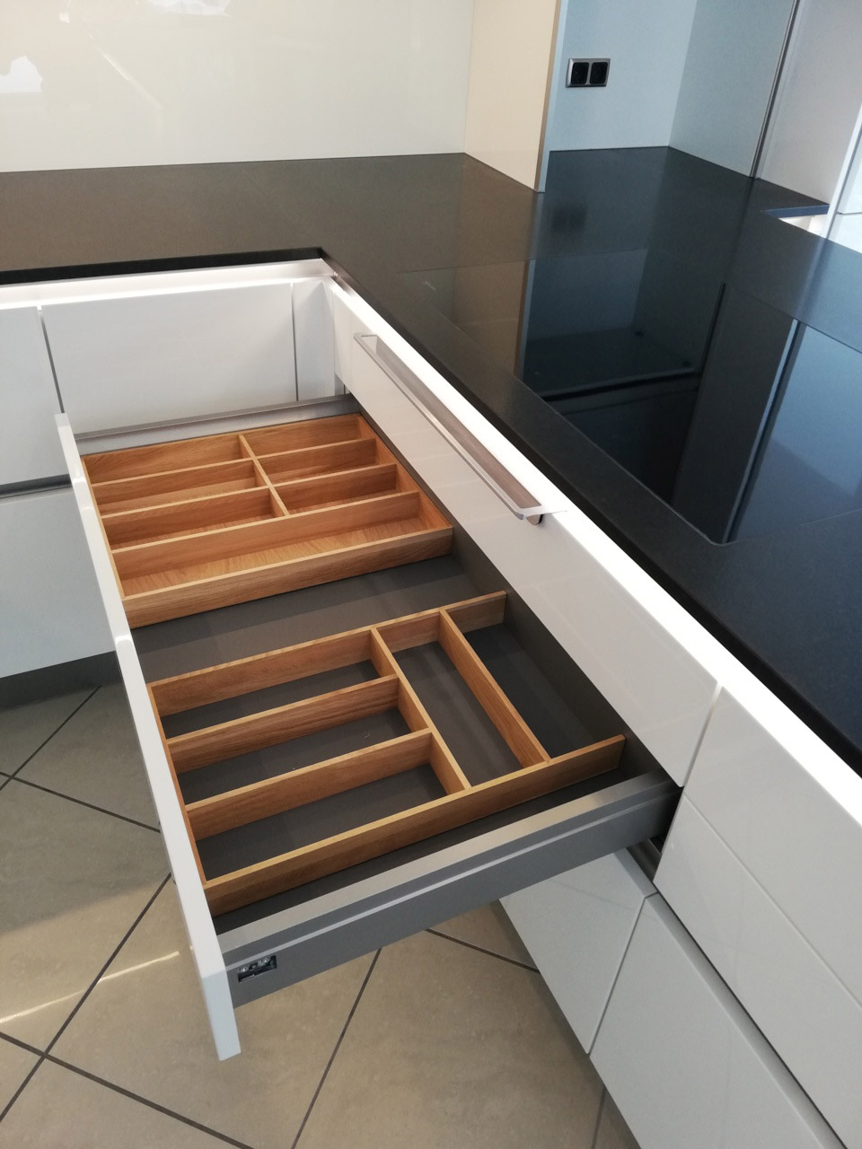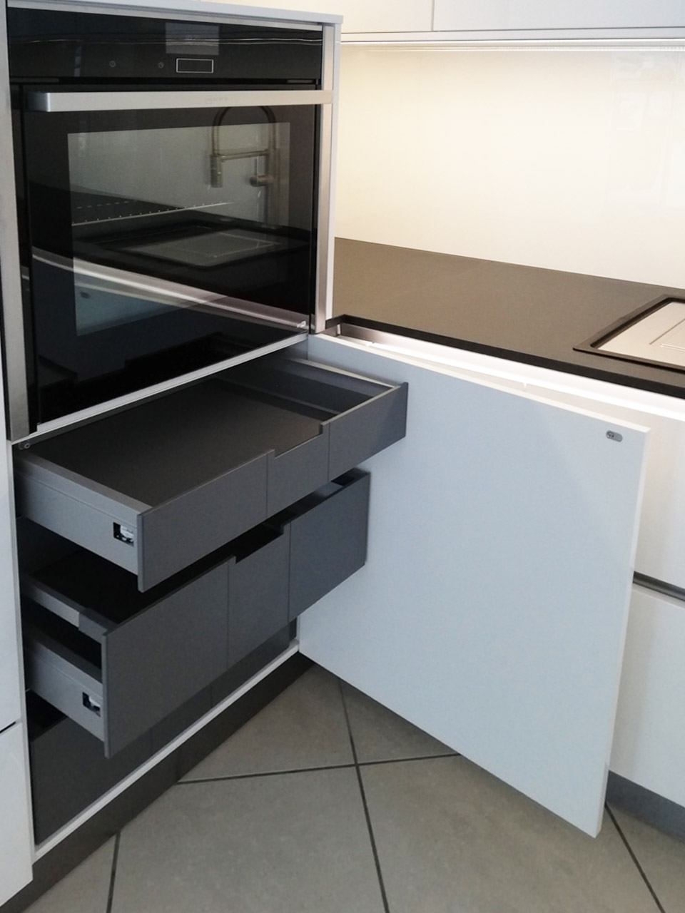 Im Rollladen-Aufsatzschrank sind Steckdosen angebracht und darunter bietet der schmale Auszugschrank auch auf wenig Fläche viel Stauraum. Geschirrspüler und Backofen befinden sich auf ergonomischer Höhe. Unterhalb des Backofens sind Innenauszüge in verschiedenen Höhen integriert. Einsätze aus Holz für Besteck und Zubehör sorgen "Hinter den Kulissen" zusätzlich für Ordnung.