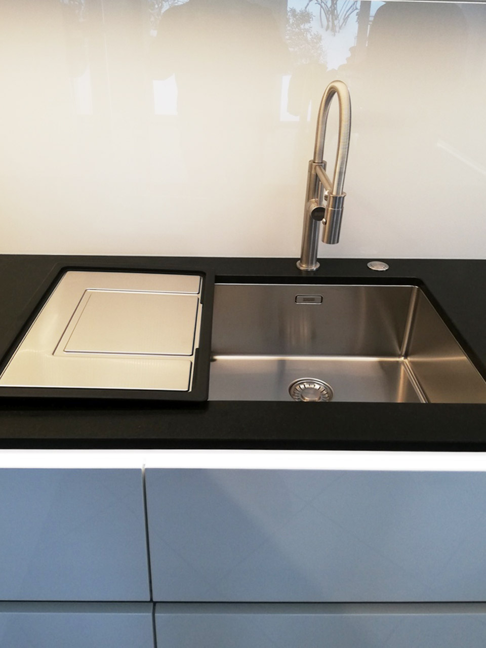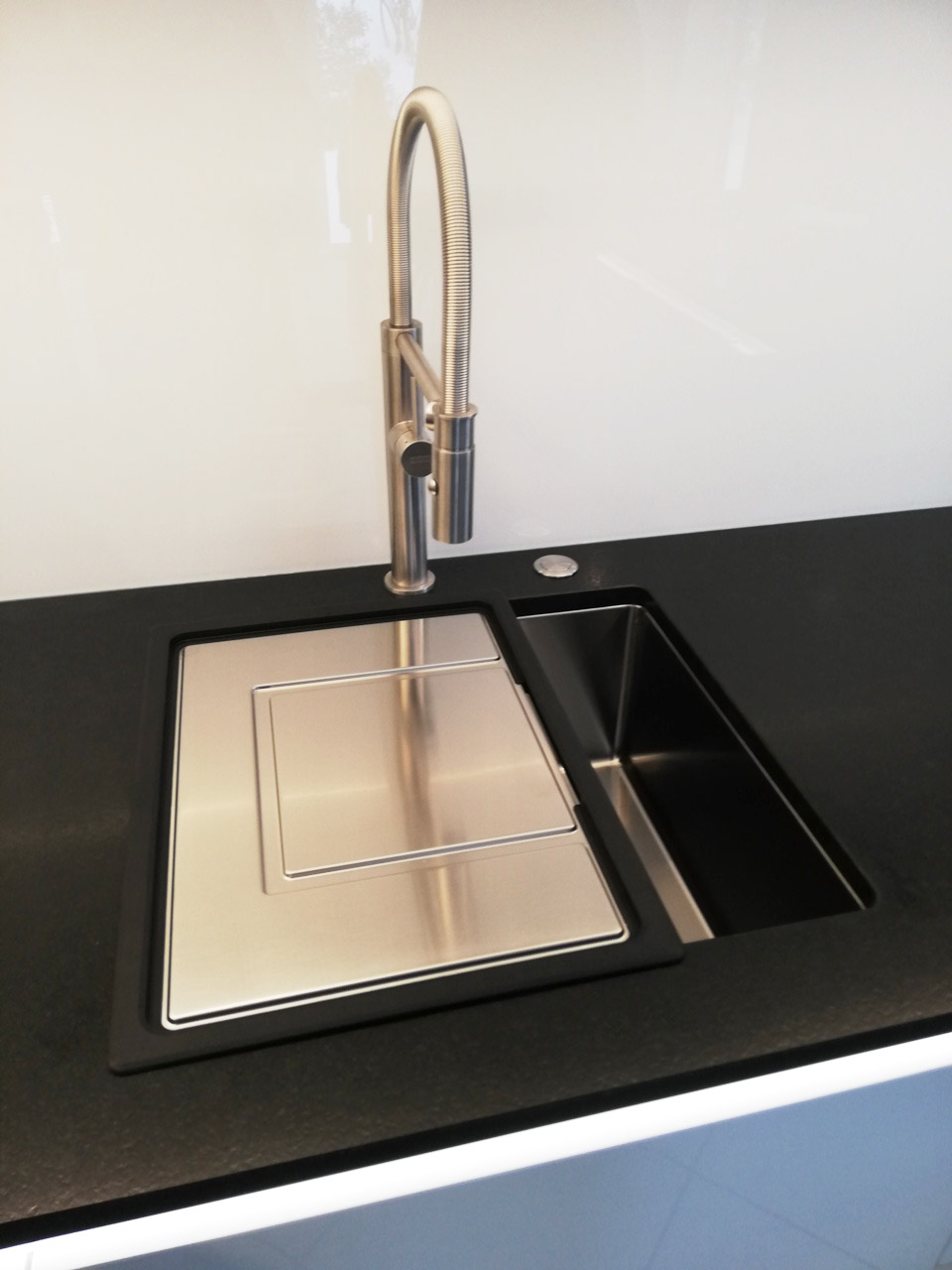 Ein weiteres Highlight ist die Unterbauspüle mit verschiebbarer Ablage. Dazu kommt ein verschiebbarer Handtuchhalter für grifflose Küchen.