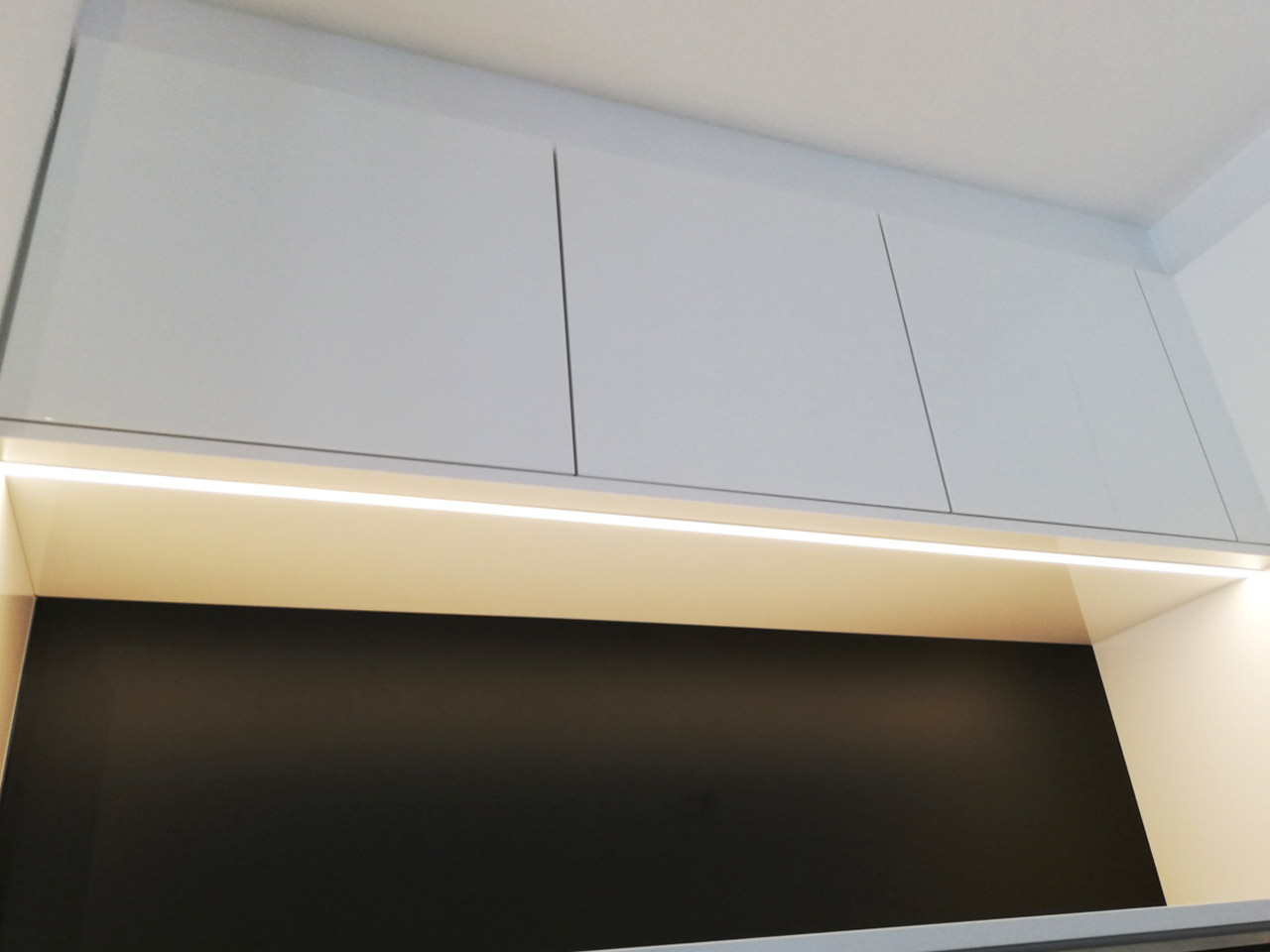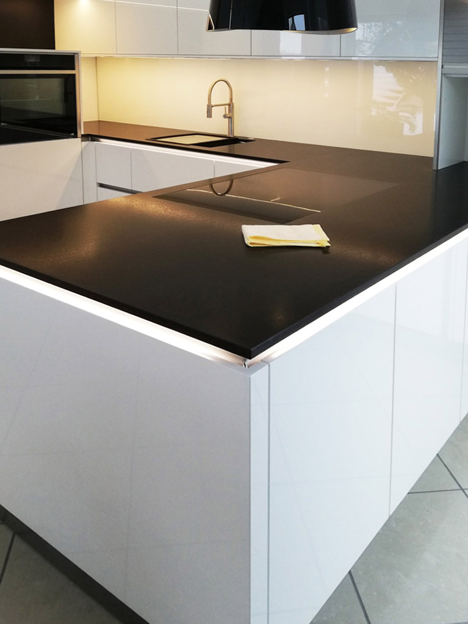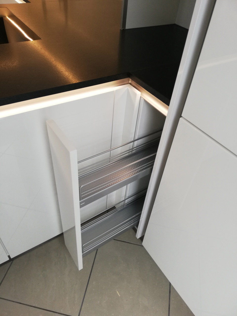 Neben einer Arbeitsplattenbeleuchtung mit eingefräster LED-Schiene, sind auch die grifflosen Schränke und Schubladen mit integrierter LED-Beleuchtung in der oberen Griffschiene ausgestattet.