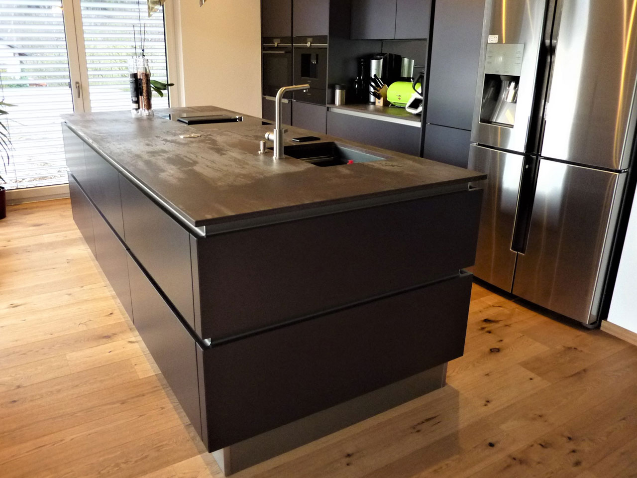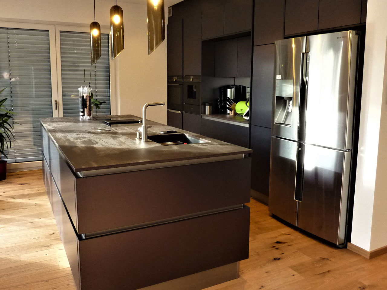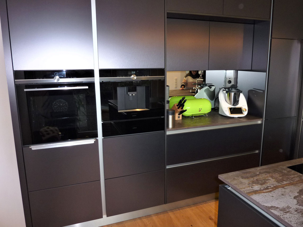 Familie Totz aus Tiefenlauter freut sich über ihre neue elegante Einbauküche mit klarer Linienführung, erreicht durch eine grifflose Planung. Die Front besteht aus hochwertigem Lacklaminat metallic geschliffen in Titan-Optik. Der Edelstahlsockel bildet einen schönen Übergang zwischen der dunklen Front und dem Holzfußboden.
