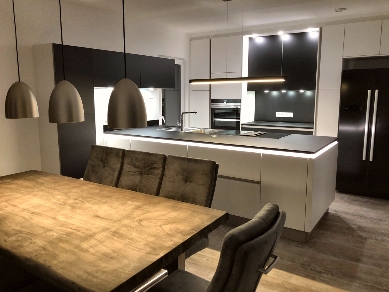 - Fronten in weiß-softmatt, klassisch kombiniert mit Fronten in schwarz-softmatt und schwarzer Arbeitsplatte.