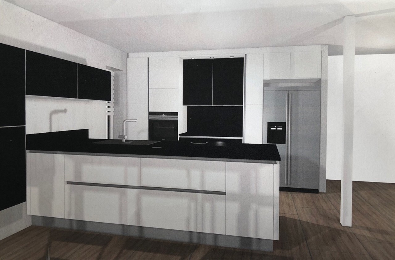 - Insel ca. 2800 x 1200 mm, von beiden Seiten in voller Tiefe nutzbar, Abstand zwischen Insel und Hochschränken ca. 1300 mm