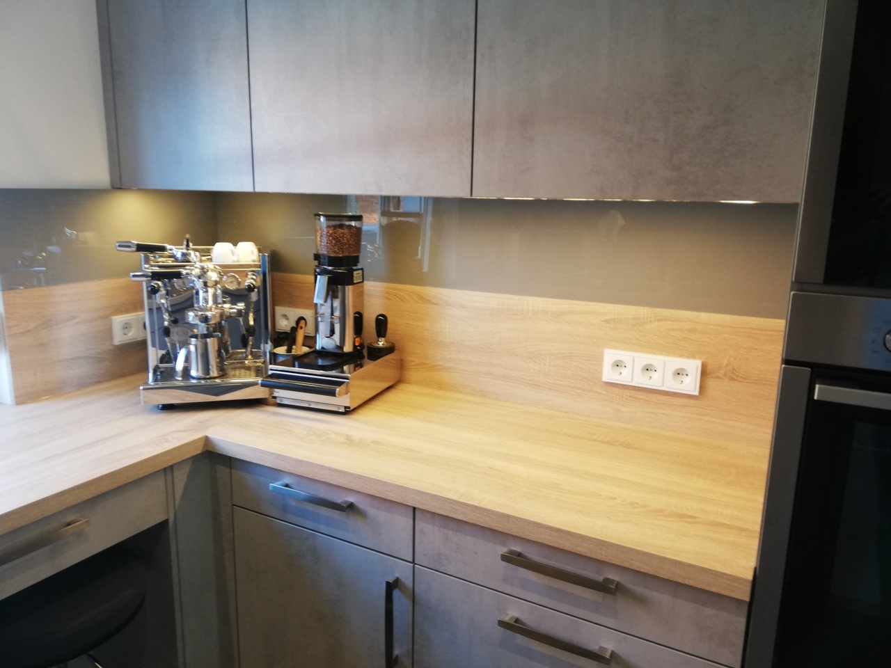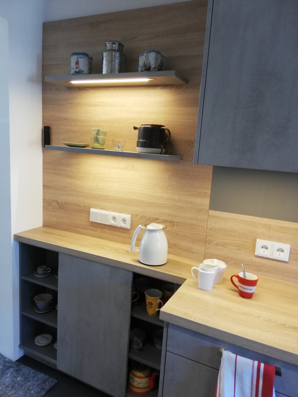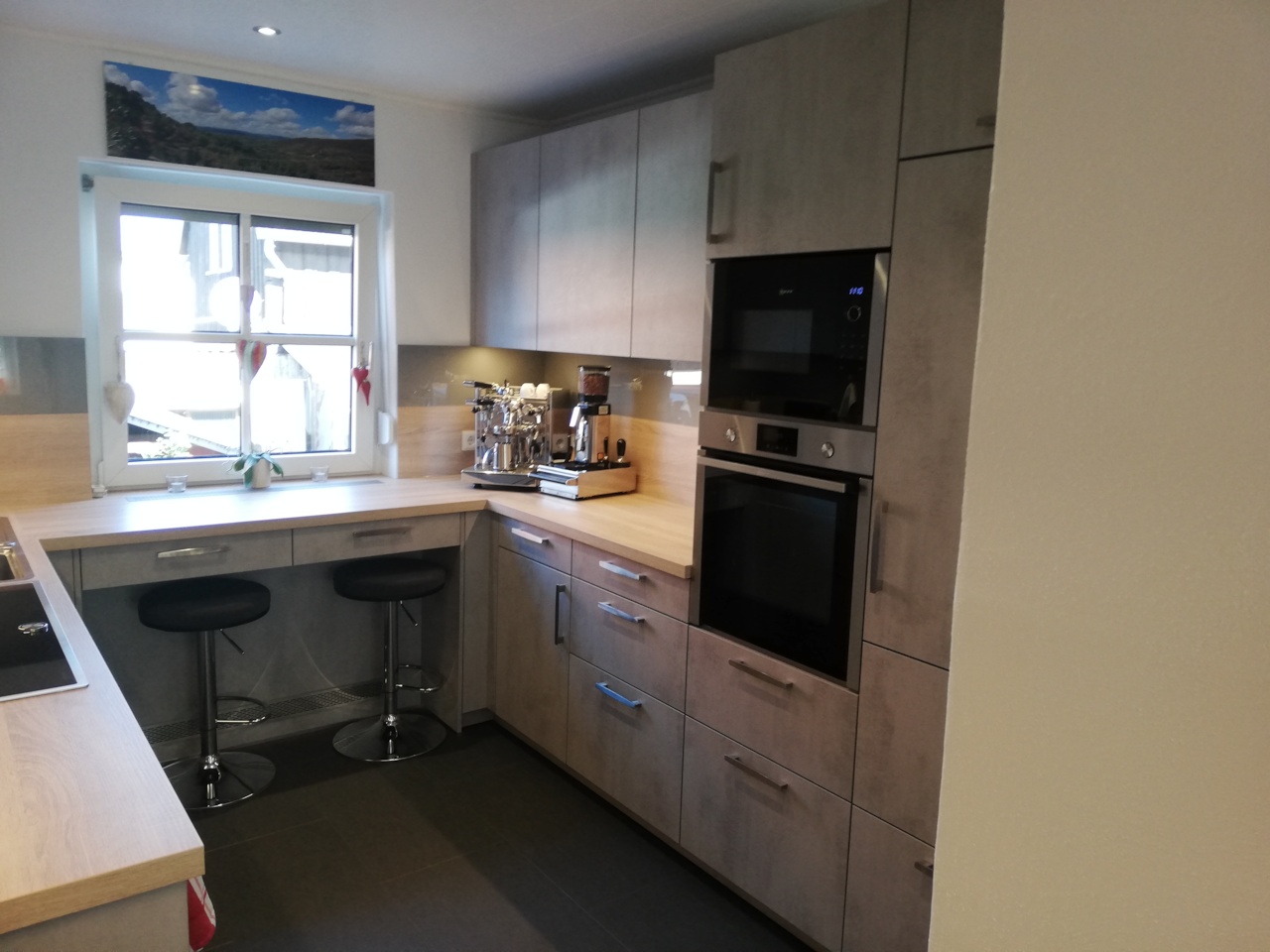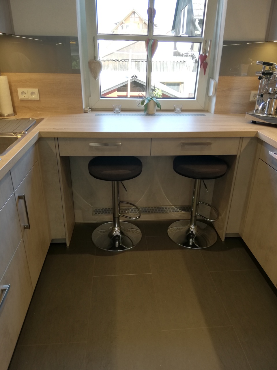 Die durchgehende Arbeitsfläche vor dem Fenster macht zusätzliche Schubladen möglich und schafft darüber hinaus eine gemütliche Sitzgelegenheit. Durch die integrierte LED-Beleuchtung in den Regalböden wird die Küche perfekt ausgeleuchtet.