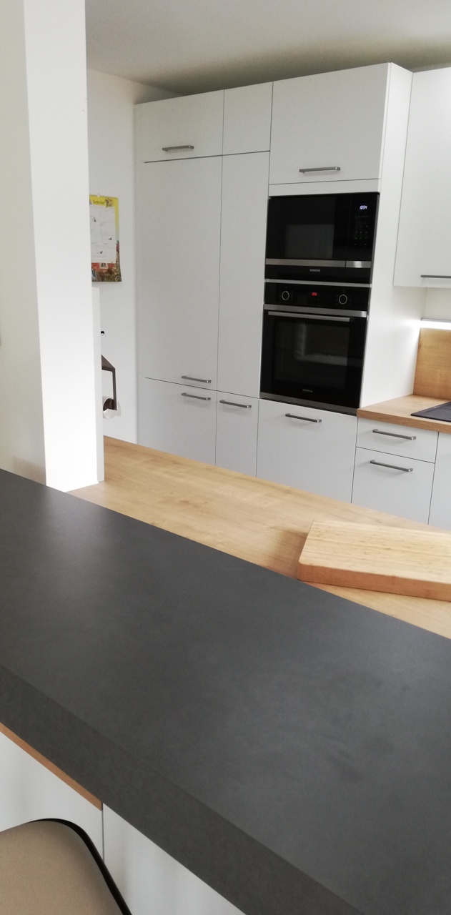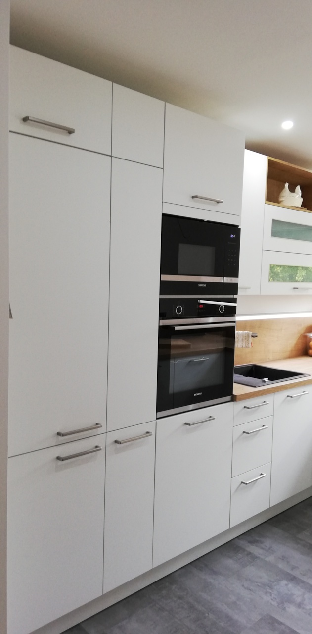 Eine helle, mit Lacklaminat in weiß-matt verkleidete Küchen und einer Arbeitsplatte aus Chaleteiche-Nachbildung.
