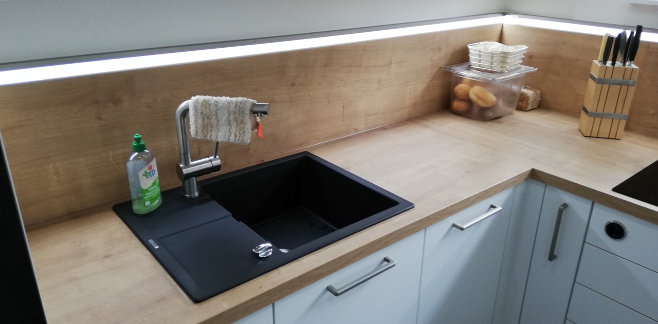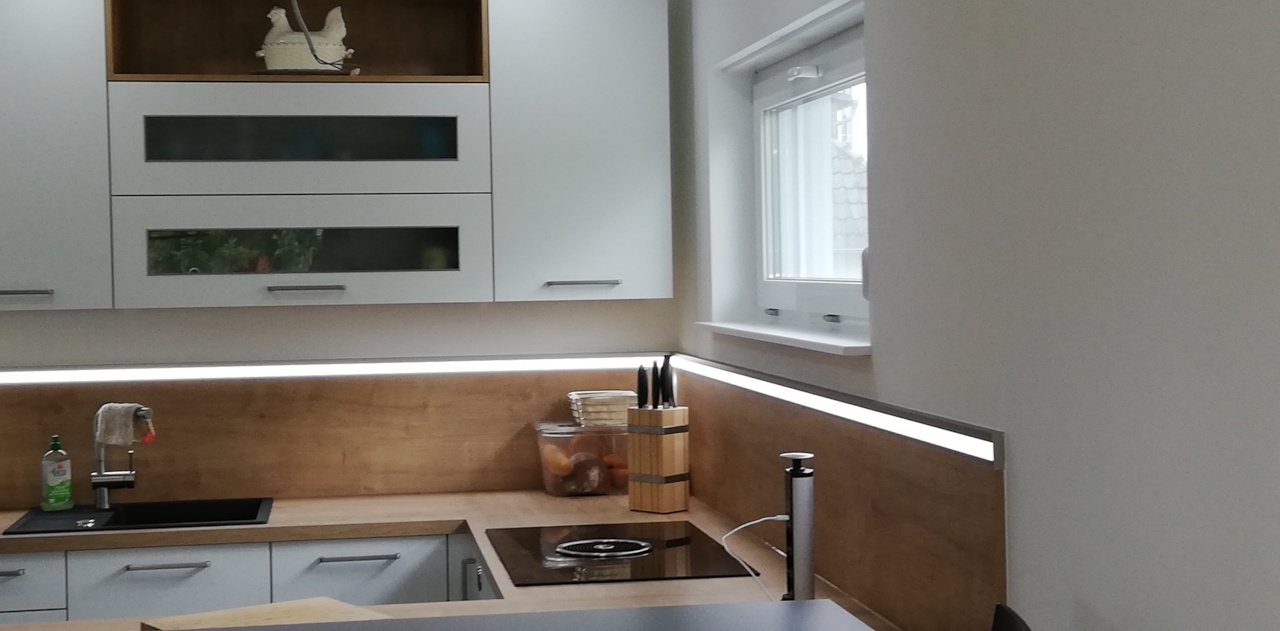 Die Aufsatzleuchte an der Nischenrückwand sorgt für eine perfekte Ausleuchtung des Arbeitsbereichs, kann zwischen den Lichtfarben warm- und kaltweiß gewechselt sowie gedimmt werden.