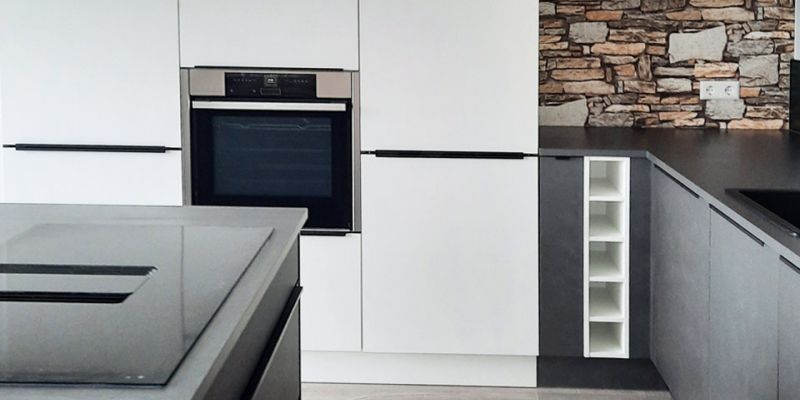 Neben einer Arbeitsplattenbeleuchtung mit eingefräster LED-Schiene, sind auch die grifflosen Schränke und Schubladen mit integrierter LED-Beleuchtung in der oberen Griffschiene ausgestattet.