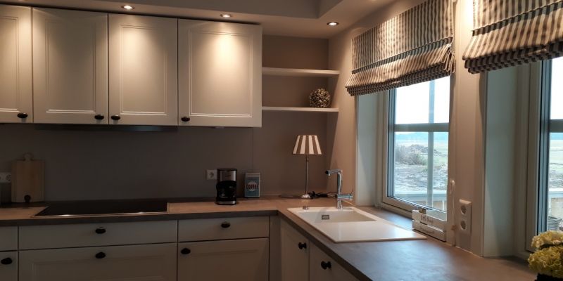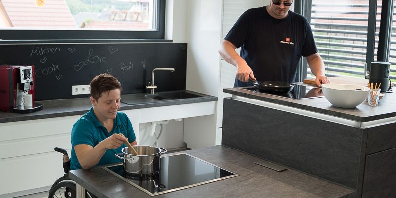 Im Rollladen-Aufsatzschrank sind Steckdosen angebracht und darunter bietet der schmale Auszugschrank auch auf wenig Fläche viel Stauraum. Geschirrspüler und Backofen befinden sich auf ergonomischer Höhe. Unterhalb des Backofens sind Innenauszüge in verschiedenen Höhen integriert. Einsätze aus Holz für Besteck und Zubehör sorgen "Hinter den Kulissen" zusätzlich für Ordnung.