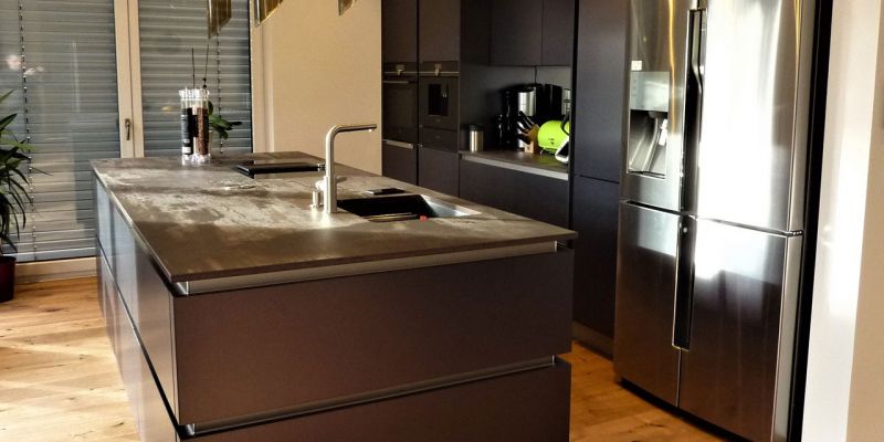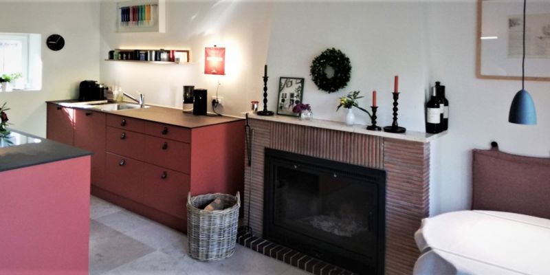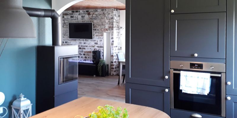 Ein besonderer Blickfang bietet hier das flächenbündig eingebaute Kochfeld und der Inseldunstabzug mit Ionisationssystem zur Luftreinigung über einen regenerierbaren Zeolith-Filter, der sich mit gleichem Lackglanz und chickem Look an das Küchendesign anpasst.